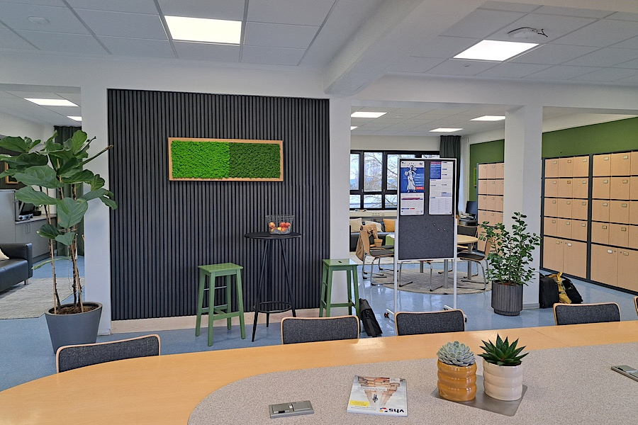Das Ergebnis kann sich sehen und hören lassen: frische grüne Akzente treffen auf wohnlich-gemütliche Elemente wie Sofas, Teppiche und Pflanzen, während die Akkustikpaneelen den Geräuschpegel angenehm regulieren.